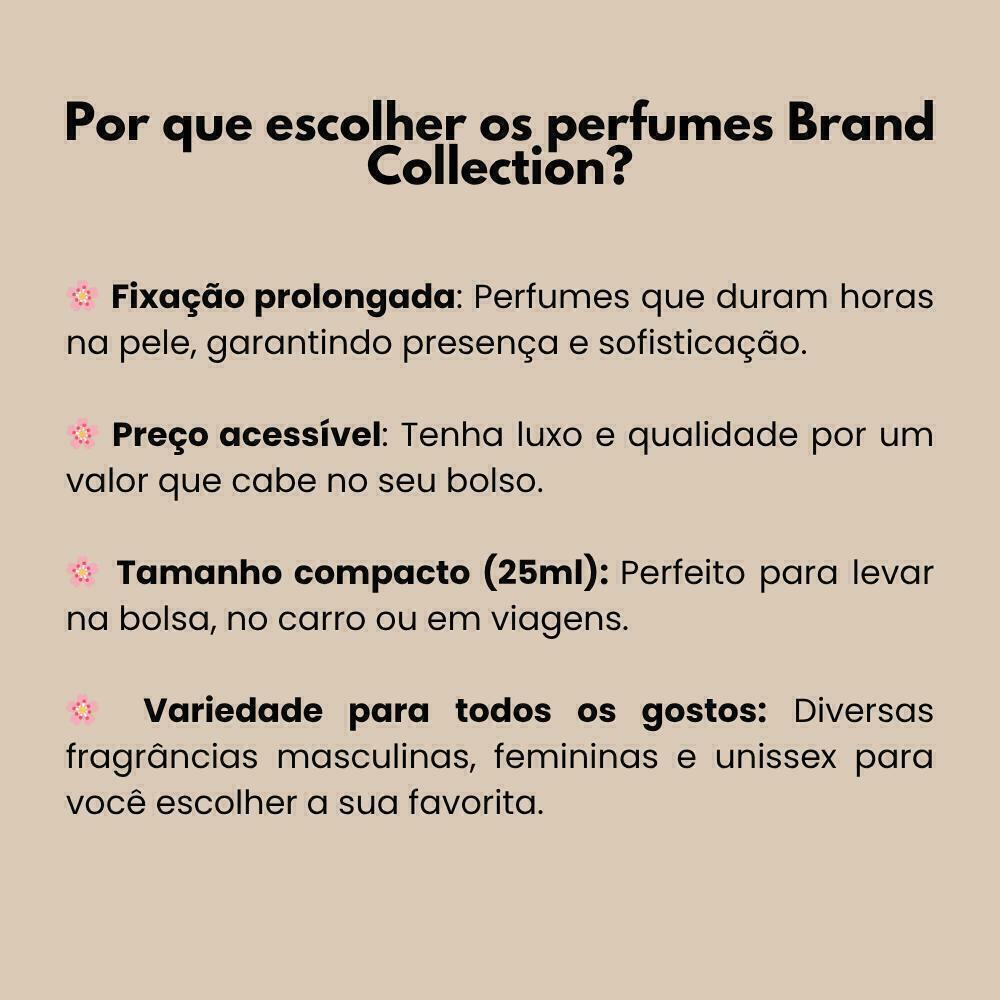 O que vem no Kit? • 01 Perfume Feminino Brand Collection 093 25ml Eau de Parfum Importado Original• 01 Hidratante Corporal Brand Collection 200mlPerfumes Brand Collection – Qualidade, praticidade e custo-benefício! Tamanho ideal para levar com você:Todos os perfumes da linha Brand Collection são desenvolvidos em formato exclusivo de 25ml, no estilo Travel Size (tamanho para viagem).Compactos e práticos, são perfeitos para carregar em bolsas, nécessaires ou malas de viagem, sem ocupar espaço.Possuem borrifador spray que facilita a aplicação e garante melhor aproveitamento da fragrância.Excelente custo-benefício:• Ideal para quem deseja ter acesso a uma grande variedade de perfumes sem precisar fazer um alto investimento.Com o valor de um perfume importado tradicional, você pode montar sua coleção com fragrâncias inspiradas nos maiores sucessos da perfumaria mundial.Dicas para potencializar sua fragrância:Sabia que o perfume dura mais quando aplicado nos pontos de maior circulação sanguínea? Veja onde aplicar:• Atrás dos joelhos• Dobras dos braços• NucaEssas áreas naturalmente exalam mais calor, o que ajuda a espalhar o aroma ao longo do dia.Como fazer o perfume durar ainda mais?• Hidrate a pele antes da aplicação.• Pele hidratada absorve melhor a fragrância e retém o aroma por mais tempo.Dica infalível: Use o hidratante da mesma linha do perfume (ou com aroma neutro) para intensificar e harmonizar o cheiro.Confira nossa linha de Hidratantes Corporais e prolongue sua experiência olfativa!Envio rápido e atendimento dedicado:• Todos os pedidos são postados em até 24 horas úteis, garantindo agilidade e cuidado com seu pedido.• Produtos enviados lacrados e bem embalados em plástico Bolha para que cheguem até você com total segurança.Não encontrou seu perfume preferido?• Fale com a gente pelo chat!• Encomende a fragrância que você deseja e nós buscamos para você.Perfume Feminino Brand Collection (Perfurme Miniatura) inspirados nos seus sonhos, com o tamanho e preço que cabem na sua rotina.