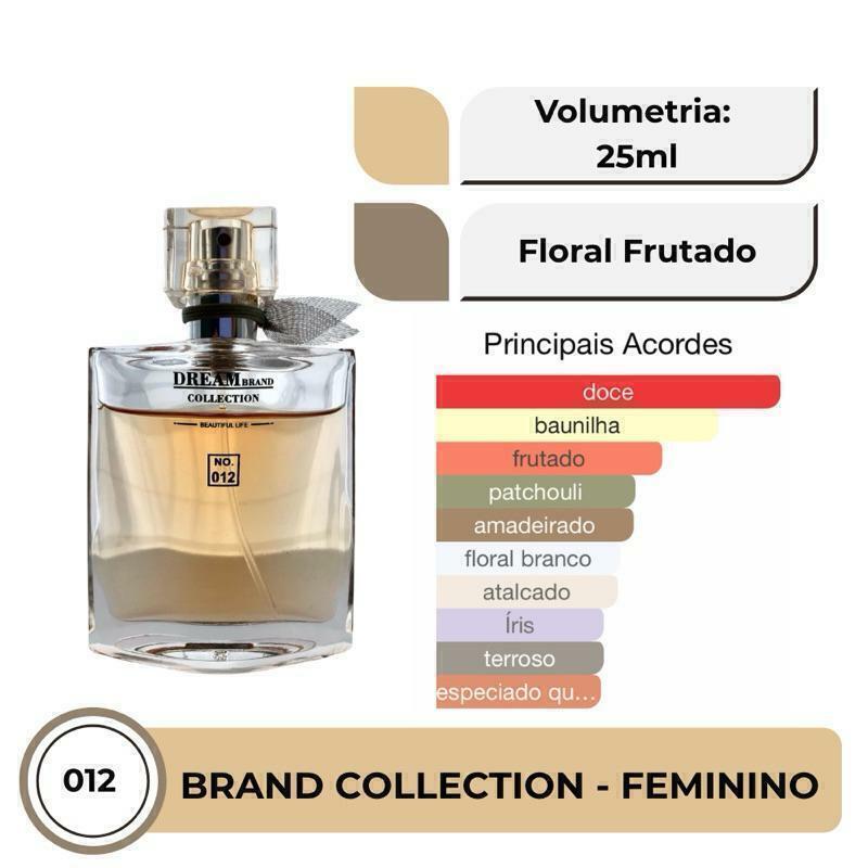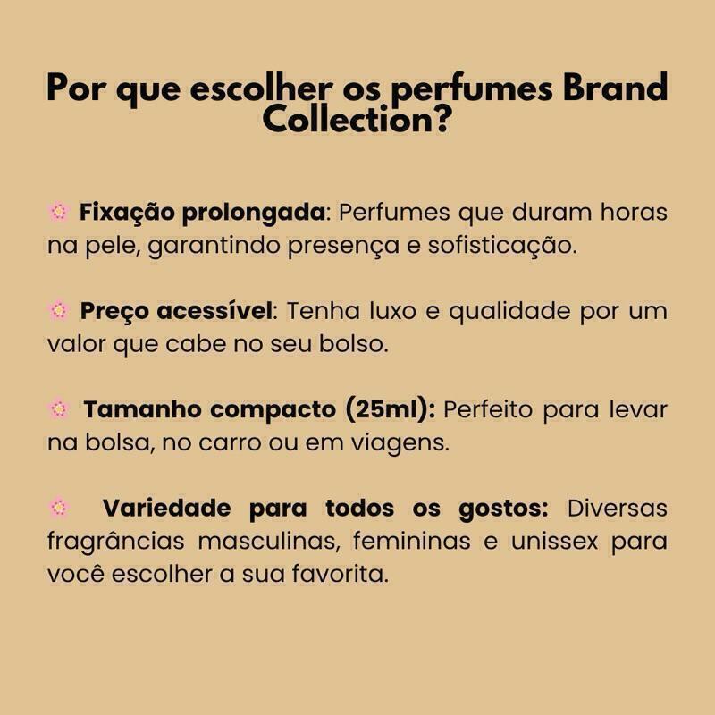 Kit Brand Collection Feminino - O que vem no Kit?01 Perfume Feminino Brand Collection 012 Eau de Parfum Importado Original 25ml01 Hidratante Corporal Brand Collection 012 - 200ml Suas notas são doces, com toque de baunilha, frutado, madeira e floral branco. Sua fragrância foi desenhada para revelar uma mulher sofisticada, sensual e ao mesmo tempo, comportada. Com certeza, irá lhe render muitos elogios!É um perfume feminino oriental gourmand. Feito com os mais preciosos ingredientes naturais, revela um manifesto de uma nova era.Perfumes Brand Collection – Qualidade, praticidade e custo-benefício!️Tamanho ideal para levar com você:Todos os perfumes da linha Brand Collection são desenvolvidos em formato exclusivo de 25ml, no estilo Travel Size (tamanho para viagem).Compactos e práticos, são perfeitos para carregar em bolsas, nécessaires ou malas de viagem, sem ocupar espaço.Possuem borrifador spray que facilita a aplicação e garante melhor aproveitamento da fragrância.Excelente custo-benefício:Ideal para quem deseja ter acesso a uma grande variedade de perfumes sem precisar fazer um alto investimento.Com o valor de um perfume importado tradicional, você pode montar sua coleção com fragrâncias inspiradas nos maiores sucessos da perfumaria mundial.Dicas para potencializar sua fragrância:Sabia que o perfume dura mais quando aplicado nos pontos de maior circulação sanguínea? Veja onde aplicar:️ Atrás dos joelhos️ Dobras dos braços️NucaEssas áreas naturalmente exalam mais calor, o que ajuda a espalhar o aroma ao longo do dia.Como fazer o perfume durar ainda mais?Hidrate a pele antes da aplicação.Pele hidratada absorve melhor a fragrância e retém o aroma por mais tempo.Dica infalível: Use o hidratante corporal da mesma linha do perfume (ou com aroma neutro) para intensificar e harmonizar o cheiro.Confira nossa linha de Hidratantes Corporais e prolongue sua experiência olfativa!Envio rápido e atendimento dedicado:Todos os pedidos são postados em até 24 horas úteis, garantindo agilidade e cuidado com seu pedido.Produtos enviados lacrados e bem embalados em plástico bolha para que cheguem até você com total segurança.Não encontrou seu perfume preferido?Fale com a gente pelo chat!Encomende a fragrância que você deseja e nós buscamos para você.Perfume Feminino Brand Collection (Perfurme Miniatura) inspirados nos seus sonhos, com o tamanho e preço que cabem na sua rotina.