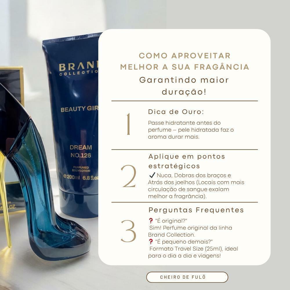 O que vem no Kit?1- Perfume Feminino Brand Collection 126 25ml Eau de Parfum Importado Original1-Creme Hidratante Corporal Brand Collection 126 200ml Perfumado O Perfume Feminino Brand Collection 126 é um oriental floral maravilhoso!Seu cheirinho, doce, com uma mistura de floral branco, baunilha, especiado quente, cacau e amadeirados deixarão sua marca no ar por onde você passar!Seu aroma é altamente marcante, considerado uma obra-prima da perfumaria. Muito sedutor, possui fixação e projeção incríveis! Então não vai ser preciso usar muitas borrifadas para marcar sua presença.Pirâmide olfativa:Topo: Amêndoa, Café, Bergamota e Limão.Corpo: Tuberosa, Jasmim Sambac, Flor de Laranjeira, Raíz de Orris ou Lírio Florentino e Rosa Búlgara.Fundo: Fava Tonka, Cacau, Baunilha, Pralinê, Sândalo, Almíscar, Âmbar, Madeira de Cashmere, Canela, Patchouli e Cedro.Perfumes Brand Collection – Qualidade, praticidade e custo-benefício! Tamanho ideal para levar com você:Todos os perfumes da linha Brand Collection são desenvolvidos em formato exclusivo de 25ml, no estilo Travel Size (tamanho para viagem).Compactos e práticos, são perfeitos para carregar em bolsas, nécessaires ou malas de viagem, sem ocupar espaço.Possuem borrifador spray que facilita a aplicação e garante melhor aproveitamento da fragrância.Excelente custo-benefício:Ideal para quem deseja ter acesso a uma grande variedade de perfumes sem precisar fazer um alto investimento.Com o valor de um perfume importado tradicional, você pode montar sua coleção com fragrâncias inspiradas nos maiores sucessos da perfumaria mundial.Dicas para potencializar sua fragrância:Sabia que o perfume dura mais quando aplicado nos pontos de maior circulação sanguínea? Veja onde aplicar:Atrás dos joelhosDobras dos braçosNucaEssas áreas naturalmente exalam mais calor, o que ajuda a espalhar o aroma ao longo do dia.Como fazer o perfume durar ainda mais?Hidrate a pele antes da aplicação.Pele hidratada absorve melhor a fragrância e retém o aroma por mais tempo.Dica infalível: Use o hidratante corporal brand collection da mesma linha do perfume (ou com aroma neutro) para intensificar e harmonizar o cheiro.Confira nossa linha de Hidratantes Corporais e prolongue sua experiência olfativa!Envio rápido e atendimento dedicado:Todos os pedidos são postados em até 24 horas úteis, garantindo agilidade e cuidado com seu pedido.Produtos enviados lacrados e bem embalados com plástico bolha para que cheguem até você com total segurança.Não encontrou seu perfume preferido?Fale com a gente pelo chat!Encomende a fragrância que você deseja e nós buscamos para você.Perfume Feminino Brand Collection (Perfurme Miniatura) inspirados nos seus sonhos, com o tamanho e preço que cabem na sua rotina.