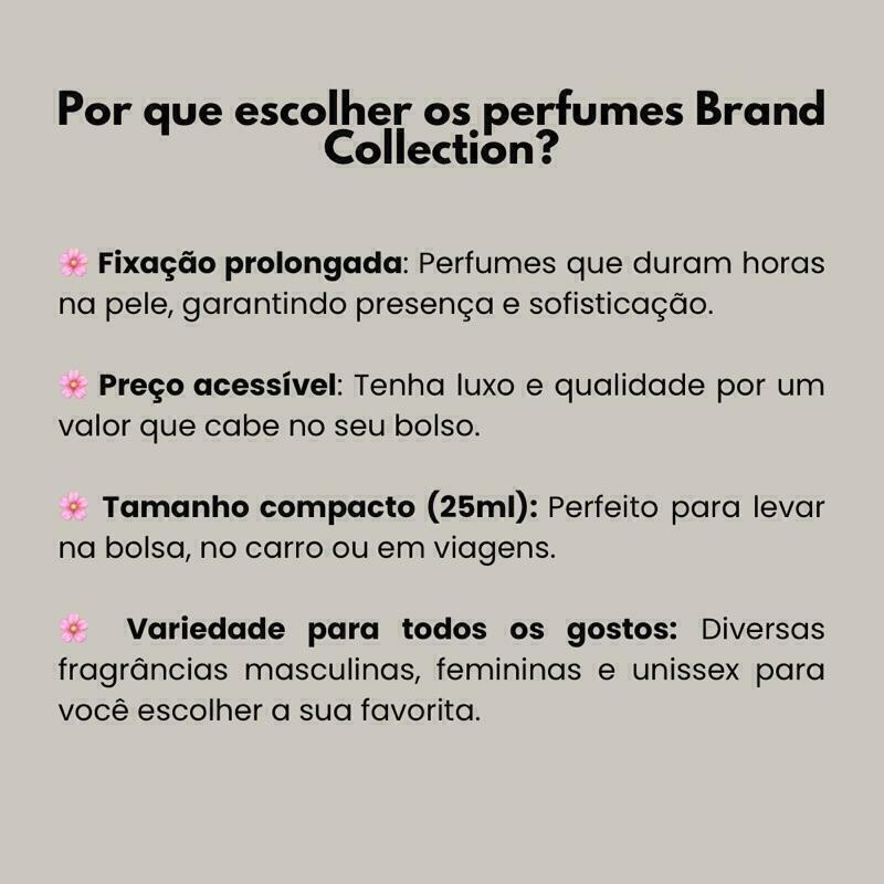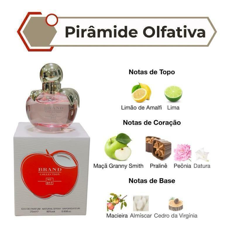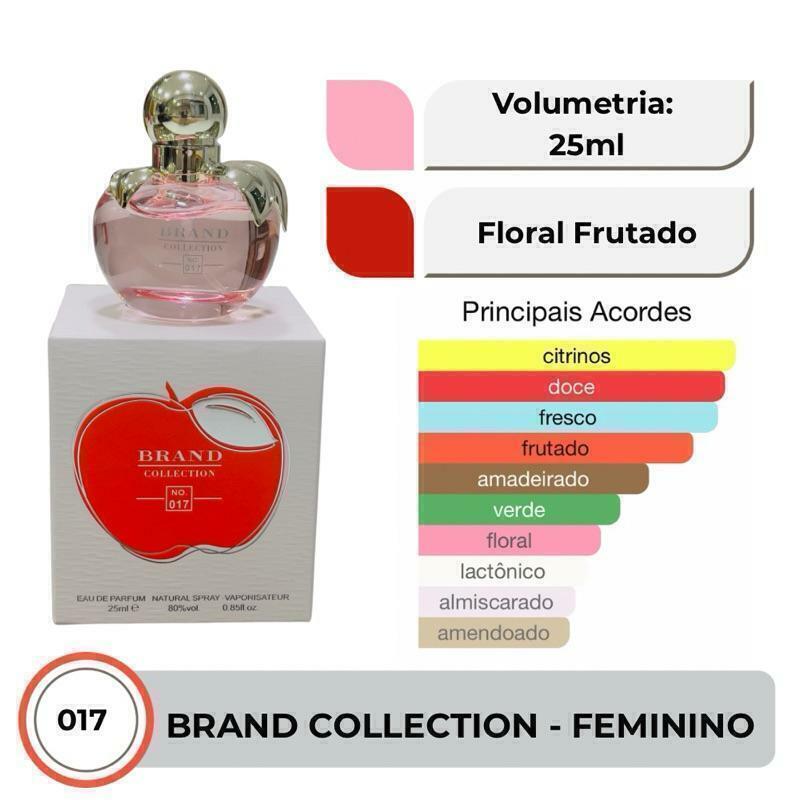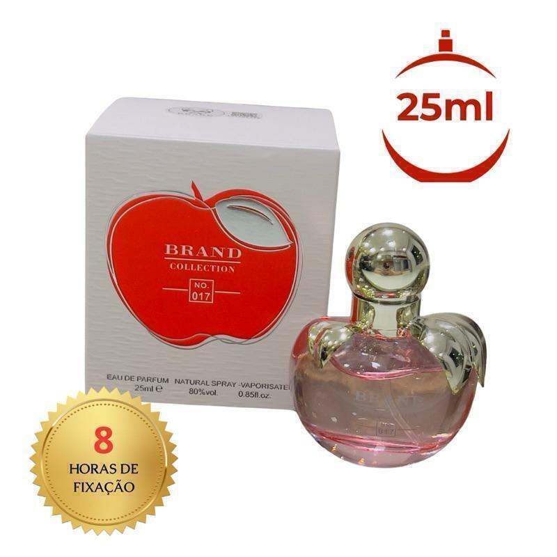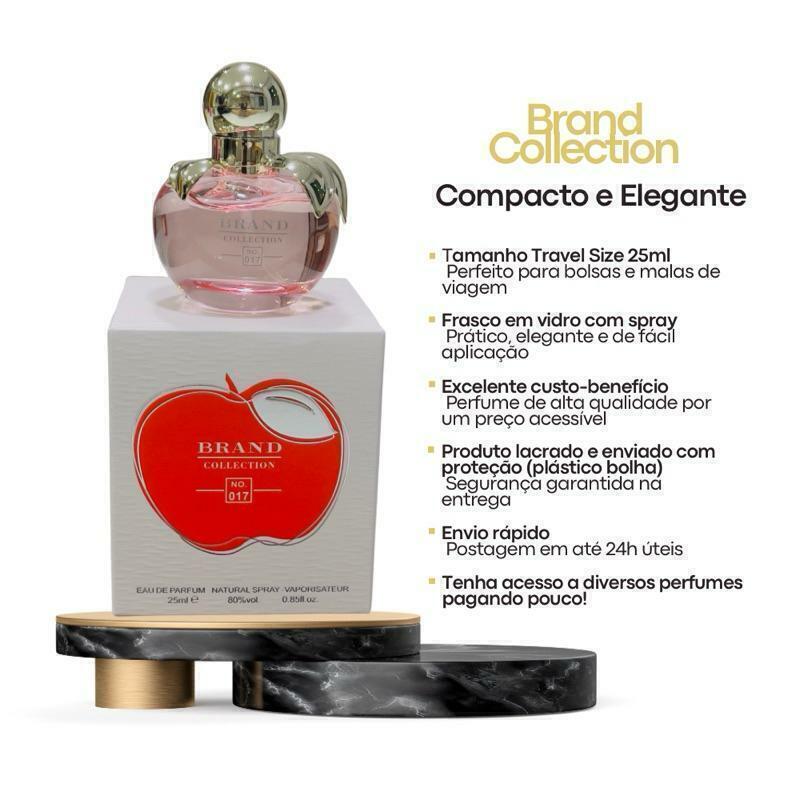 Perfume Feminino Brand Collection 017 Eau de Parfum Importado OriginalÉ um perfume feminino floral frutal, com um toque de magia, reflete toda a doçura e a delicadeza da mulher jovial.A fragrância traz um irresistível ar de mistério, encanto e sedução. Além das notas adocicadas da Maçã, que traduz toda a inocência da jovem adulta, o aroma conta também com os acordes imprevisíveis de Limão, Pralinê, Almíscar e Cedro. O resultado é um perfume romântico, encantador e audacioso, ideal para abrilhantar o look angelical daquela que sonha viver um conto de fadas moderno.Perfumes Brand Collection – Qualidade, praticidade e custo-benefício!️Tamanho ideal para levar com você:Todos os perfumes da linha Brand Collection são desenvolvidos em formato exclusivo de 25ml, no estilo Travel Size (tamanho para viagem).Compactos e práticos, são perfeitos para carregar em bolsas, nécessaires ou malas de viagem, sem ocupar espaço.Possuem borrifador spray que facilita a aplicação e garante melhor aproveitamento da fragrância.Excelente custo-benefício:Ideal para quem deseja ter acesso a uma grande variedade de perfumes sem precisar fazer um alto investimento.Com o valor de um perfume importado tradicional, você pode montar sua coleção com fragrâncias inspiradas nos maiores sucessos da perfumaria mundial.Dicas para potencializar sua fragrância:Sabia que o perfume dura mais quando aplicado nos pontos de maior circulação sanguínea? Veja onde aplicar:️ Atrás dos joelhos️ Dobras dos braços️ NucaEssas áreas naturalmente exalam mais calor, o que ajuda a espalhar o aroma ao longo do dia.Como fazer o perfume durar ainda mais?Hidrate a pele antes da aplicação.Pele hidratada absorve melhor a fragrância e retém o aroma por mais tempo.Dica infalível: Use o hidratante da mesma linha do perfume (ou com aroma neutro) para intensificar e harmonizar o cheiro.Confira nossa linha de Hidratantes Corporais e prolongue sua experiência olfativa!Envio rápido e atendimento dedicado:Todos os pedidos são postados em até 24 horas úteis, garantindo agilidade e cuidado com seu pedido.Produtos enviados lacrados e bem embalados para que cheguem até você com total segurança.Não encontrou seu perfume preferido?Fale com a gente pelo chat!Encomende a fragrância que você deseja e nós buscamos para você.Perfume Feminino Brand Collection (Perfurme Miniatura) inspirados nos seus sonhos, com o tamanho e preço que cabem na sua rotina.