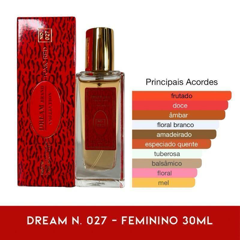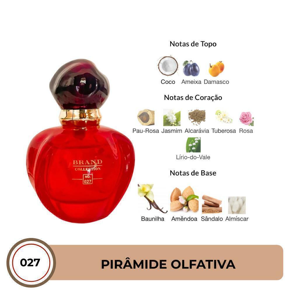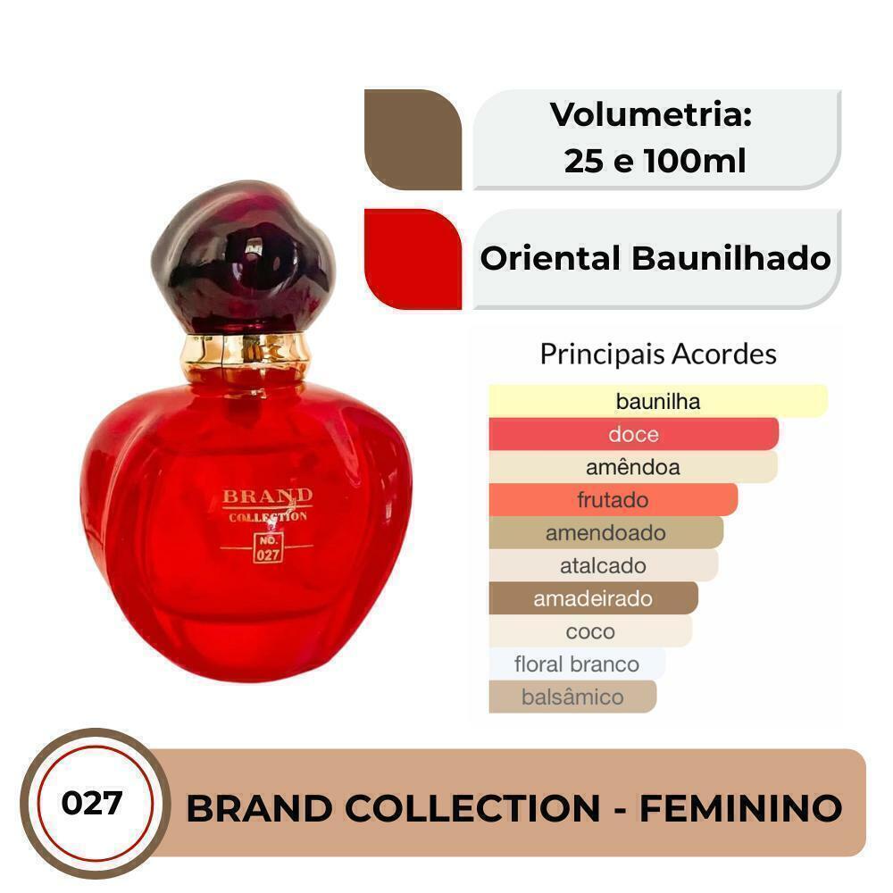 Perfume Feminino Brand Collection 027 – Disponível nas versões: 25ml, 30ml e 100mlPrincipais Benefícios:Fragrância sofisticada e sensual: Ideal para mulheres que querem deixar uma marca inesquecível.Temos nas opções Tamanho Travel Size (25ml e 30ml): Prático para levar na bolsa, em viagens ou para o dia a dia (Perfume de Bolsa e Perfume Tubete).Frasco elegante e delicado: Produzido em vidro com design refinado e borrifador spray.Fragrância com matéria-prima refinada: Alta similaridade olfativa com perfumes importados famosos.Produto lacrado e protegido: Embalado em plástico bolha para garantir total segurança no transporte.Envio rápido: Postagem em até 24 horas úteis após a confirmação da compra.Pirâmide Olfativa – Brand Collection 027Notas de Topo: Coco, Ameixa e DamascoNotas de Coração: Pau-Rosa, Jasmim, Alcarávia, Tuberosa, Rosa e Lírio-do-ValeNotas de Fundo: Baunilha, Amêndoa, Sândalo e AlmíscarEssa composição cria uma fragrância oriental adocicada, cremosa e marcante – perfeita para mulheres com personalidade forte e estilo único.É original?Sim! O produto é original da linha Brand Collection.Tem boa fixação?Sim! Apesar de compacto, o perfume possui excelente rendimento e ótima fixação para o dia a dia.É pequeno demais?O tamanho Travel Size (25ml e 30ml) é perfeito para levar com você para qualquer lugar – discreto, prático e elegante. Mas se preferir, temos no tamanho grande (100ml)E se quebrar no transporte?Não se preocupe: todos os frascos são embalados com plástico bolha e protegidos com muito cuidado para garantir que chegue perfeito até você.Conselho de aplicaçãoAplique utilizando o borrifador spray, concentrando o perfume sobre áreas que fixem melhor a perfumação, como regiões onde a circulação de sangue é maior: como pulsos, nuca, atrás das orelhas e dobras. Para melhor conservação do produto, mantenha-o em locais secos, longe do calor extremo e da luz solar direta.Cuide para não aplicar sobre os olhos, pois pode causar irritações.Os Eau de Parfum possuem uma concentração de fragrância (essência) de até 20% de sua composição, por isso sua fixação pode ser mais potente.Ocasião:Perfume quente, extremamente sedutor. Ideal para noites mais frias de outono e inverno ou ocasiões especiais que pedem um perfume mais envolvente e profundo.