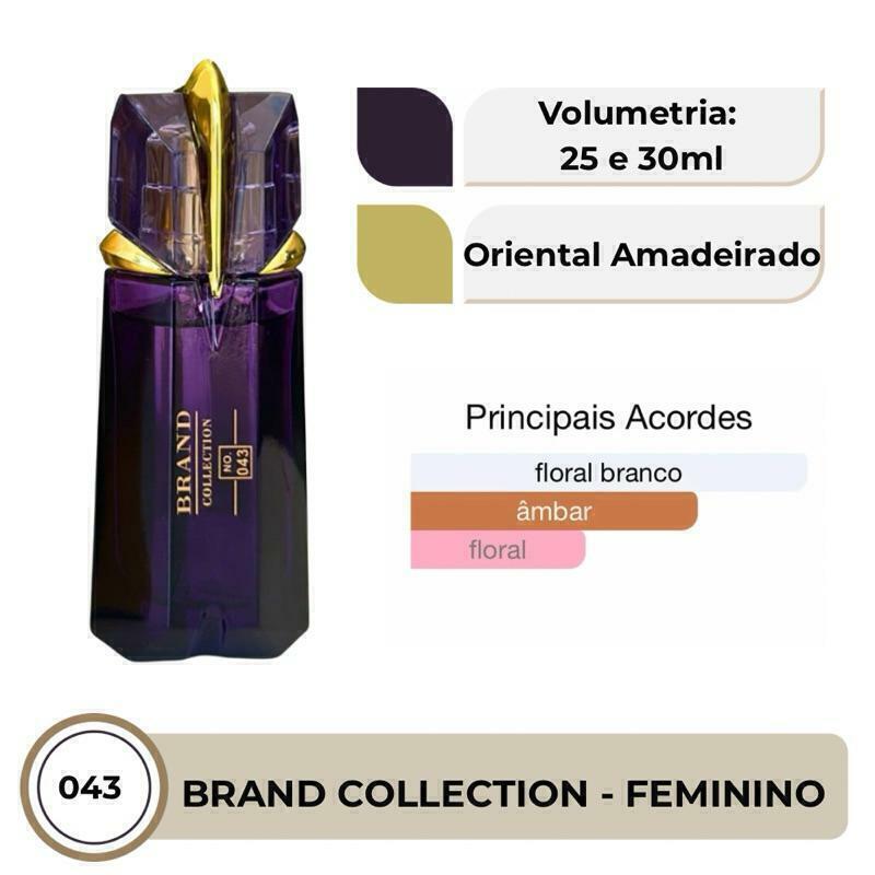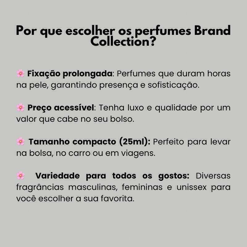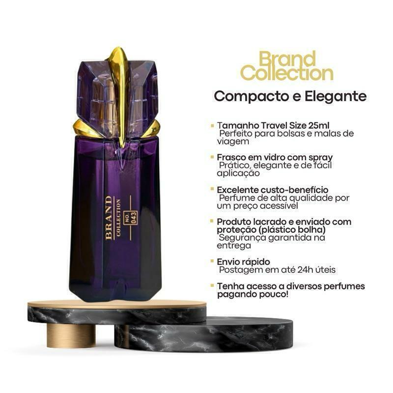 Perfume feminino Brand Collection 043 Eau de Parfum Importado Original️Tamanho ideal para levar com você:Todos os perfumes da linha Brand Collection são desenvolvidos em formato exclusivo de 25ml, no estilo Travel Size (tamanho para viagem).Compactos e práticos, são perfeitos para carregar em bolsas, nécessaires ou malas de viagem, sem ocupar espaço.Possuem borrifador spray que facilita a aplicação e garante melhor aproveitamento da fragrância.Excelente custo-benefício:Ideal para quem deseja ter acesso a uma grande variedade de perfumes sem precisar fazer um alto investimento.Com o valor de um perfume importado tradicional, você pode montar sua coleção com fragrâncias inspiradas nos maiores sucessos da perfumaria mundial.Dicas para potencializar sua fragrância:Sabia que o perfume dura mais quando aplicado nos pontos de maior circulação sanguínea? Veja onde aplicar:️ Atrás dos joelhos️ Dobras dos braços️ NucaEssas áreas naturalmente exalam mais calor, o que ajuda a espalhar o aroma ao longo do dia.Como fazer o perfume durar ainda mais?Hidrate a pele antes da aplicação.Pele hidratada absorve melhor a fragrância e retém o aroma por mais tempo.Dica infalível: Use o hidratante corporal brand collection da mesma linha do perfume (ou com aroma neutro) para intensificar e harmonizar o cheiro.Confira nossa linha de Hidratantes Corporais e prolongue sua experiência olfativa!Envio rápido e atendimento dedicado:Todos os pedidos são postados em até 24 horas úteis, garantindo agilidade e cuidado com seu pedido.Produtos enviados lacrados e bem embalados em plástico bolha para que cheguem até você com total segurança.Não encontrou seu perfume preferido?Fale com a gente pelo chat!Encomende a fragrância que você deseja e nós buscamos para você.Perfume Feminino Brand Collection (Perfurme Miniatura) inspirados nos seus sonhos, com o tamanho e preço que cabem na sua rotina.