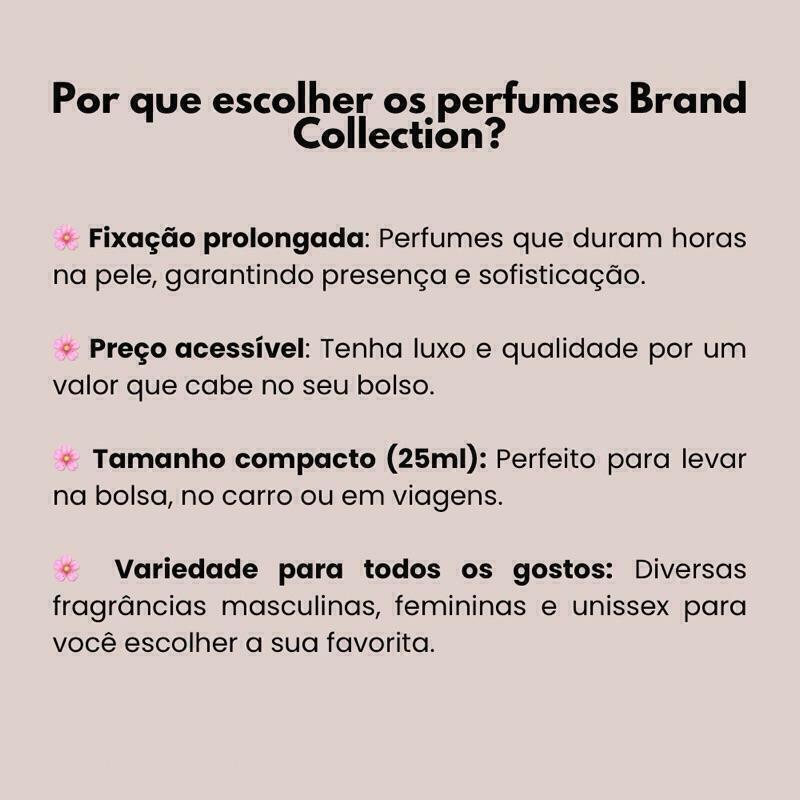 Perfume Feminino Brand Collection 294 Eau de Parfum - Taboos Rouge Original ImportadoPerfume feminino floral amadeirado picante. Um perfume que apresenta uma combinação sensual de notas, que revela um buquê floral branco tingido de vermelho profundo. Flor de laranjeira luminosa e jasmim são inflamadas com um acorde vermelho picante de laranja e gengibre. O sândalo suave deixa um rastro de possibilidades tentadoras.Pirâmide olfativa:• Topo: Gengibre e Laranja Sanguínea.• Corpo: Tuberosa, Jasmim e Folha de Pimenta.• Fundo: Sândalo, Patchouli e Vetiver.Ocasião:Uma fragrância para marcar presença por onde passa. Combina muito com climas mais frescos, principalmente a noite!Perfumes Brand Collection – Qualidade, praticidade e custo-benefício!️Tamanho ideal para levar com você:Todos os perfumes da linha Brand Collection são desenvolvidos em formato exclusivo de 25ml, no estilo Travel Size (tamanho para viagem).Compactos e práticos, são perfeitos para carregar em bolsas, nécessaires ou malas de viagem, sem ocupar espaço.Possuem borrifador spray que facilita a aplicação e garante melhor aproveitamento da fragrância.Excelente custo-benefício:Ideal para quem deseja ter acesso a uma grande variedade de perfumes sem precisar fazer um alto investimento.Com o valor de um perfume importado tradicional, você pode montar sua coleção com fragrâncias inspiradas nos maiores sucessos da perfumaria mundial.Dicas para potencializar sua fragrância:Sabia que o perfume dura mais quando aplicado nos pontos de maior circulação sanguínea? Veja onde aplicar:️ Atrás dos joelhos️ Dobras dos braços️ NucaEssas áreas naturalmente exalam mais calor, o que ajuda a espalhar o aroma ao longo do dia.Como fazer o perfume durar ainda mais?Hidrate a pele antes da aplicação.Pele hidratada absorve melhor a fragrância e retém o aroma por mais tempo.Dica infalível: Use o hidratante corporal da mesma linha do perfume (ou com aroma neutro) para intensificar e harmonizar o cheiro.Confira nossa linha de Hidratantes Corporais e prolongue sua experiência olfativa!Envio rápido e atendimento dedicado:Todos os pedidos são postados em até 24 horas úteis, garantindo agilidade e cuidado com seu pedido.Produtos enviados lacrados e bem embalados em plástico bolha para que cheguem até você com total segurança.Não encontrou seu perfume preferido?Fale com a gente pelo chat!Encomende a fragrância que você deseja e nós buscamos para você.Perfume Feminino Brand Collection (Perfurme Miniatura) inspirados nos seus sonhos, com o tamanho e preço que cabem na sua rotina.