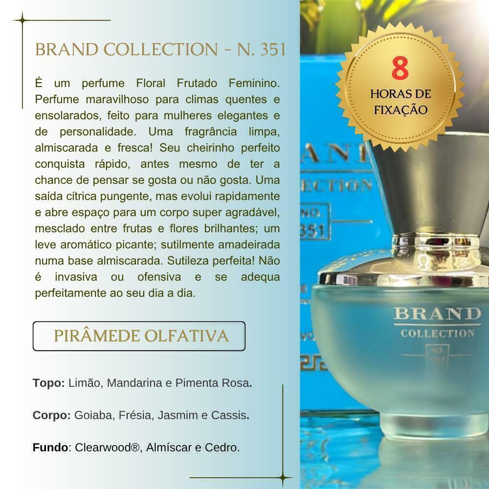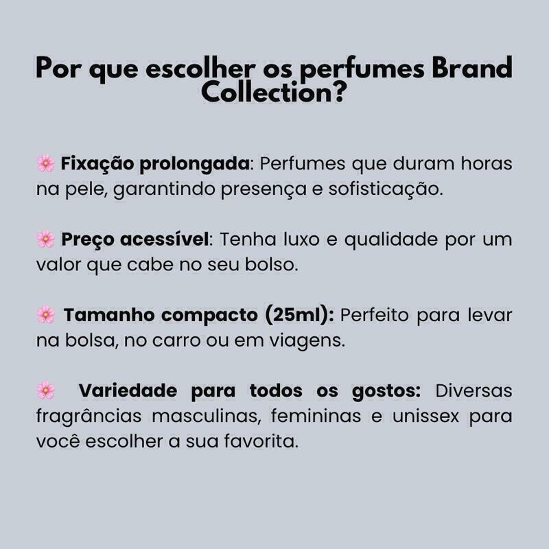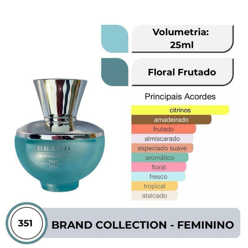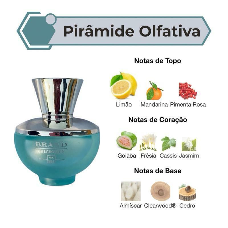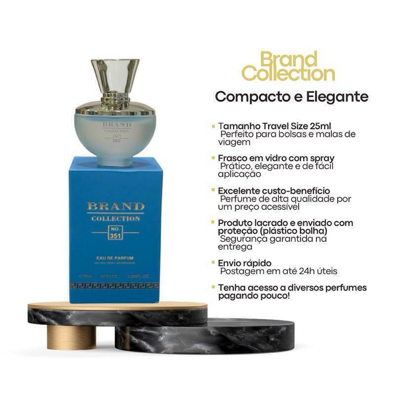 Perfume Feminino Brand Collection 351 Eau de Parfum Importado Original• É um perfume Floral Frutado Feminino. Perfume maravilhoso para climas quentes e ensolarados, feito para mulheres elegantes e de personalidade.• Que azul fabuloso! Uma fragrância limpa, almiscarada e fresca! Seu cheirinho perfeito conquista rápido, antes mesmo de ter a chance de pensar se gosta ou não gosta. Uma saída cítrica pungente, mas evolui rapidamente e abre espaço para um corpo super agradável, mesclado entre frutas e flores brilhantes; um leve aromático picante; sutilmente amadeirada numa base almiscarada. Sutileza perfeita! Não é invasiva ou ofensiva e se adequa perfeitamente ao seu dia a dia.Perfumes Brand Collection – Qualidade, praticidade e custo-benefício!️Tamanho ideal para levar com você:Todos os perfumes da linha Brand Collection são desenvolvidos em formato exclusivo de 25ml, no estilo Travel Size (tamanho para viagem).Compactos e práticos, são perfeitos para carregar em bolsas, nécessaires ou malas de viagem, sem ocupar espaço.Possuem borrifador spray que facilita a aplicação e garante melhor aproveitamento da fragrância.Excelente custo-benefício:Ideal para quem deseja ter acesso a uma grande variedade de perfumes sem precisar fazer um alto investimento.Com o valor de um perfume importado tradicional, você pode montar sua coleção com fragrâncias inspiradas nos maiores sucessos da perfumaria mundial.Dicas para potencializar sua fragrância:Sabia que o perfume dura mais quando aplicado nos pontos de maior circulação sanguínea? Veja onde aplicar:️ Atrás dos joelhos️ Dobras dos braços️ NucaEssas áreas naturalmente exalam mais calor, o que ajuda a espalhar o aroma ao longo do dia.Como fazer o perfume durar ainda mais?Hidrate a pele antes da aplicação.Pele hidratada absorve melhor a fragrância e retém o aroma por mais tempo.Dica infalível: Use o hidratante corporal da mesma linha do perfume (ou com aroma neutro) para intensificar e harmonizar o cheiro.Confira nossa linha de Hidratantes Corporais e prolongue sua experiência olfativa!Envio rápido e atendimento dedicado:Todos os pedidos são postados em até 24 horas úteis, garantindo agilidade e cuidado com seu pedido.Produtos enviados lacrados e bem embalados em plástico bolha para que cheguem até você com total segurança.Não encontrou seu perfume preferido?Fale com a gente pelo chat!Encomende a fragrância que você deseja e nós buscamos para você.Perfume Feminino Brand Collection (Perfurme Miniatura) inspirados nos seus sonhos, com o tamanho e preço que cabem na sua rotina.