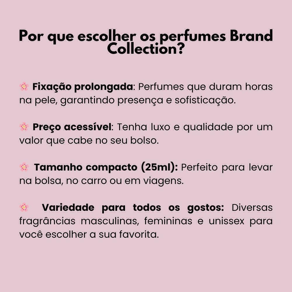 Perfume Feminino Brand Collection 395 – 25ml (Idêntico a foto) Eau de Parfum Importado OriginalPrincipais Benefícios:Fragrância alegre e moderna: Um perfume divertido, jovem e cheio de atitude, ideal para quem ama aromas doces e vibrantes.Tamanho Travel Size (25ml): Prático para o dia a dia, viagens ou para levar na bolsa com facilidade.Frasco em vidro com spray: Design delicado e funcional, fácil de aplicar e com excelente rendimento.Matéria-prima refinada: Fragrância com alta similaridade olfativa, inspirada em perfumes importados de prestígio.Produto lacrado e protegido: Vai embalado com plástico bolha, garantindo que chegue intacto até você.Envio ágil: Postagem garantida em até 24 horas úteis após confirmação da compra.Pirâmide Olfativa – Brand Collection 395Notas de Topo: Chiclete, laranja amarga, limão sicilianoNotas de Coração: Rosa búlgara, gengibre, pêssego, canela, mirtilo e pêssegoNotas de Fundo: Almíscar, cedro e ambroxanO resultado é uma fragrância doce e frutada com um toque levemente picante e fresco – perfeita para quem busca um perfume alegre, jovem e marcante.É original?Sim! Esse é um produto original da linha Brand Collection.Não vai ser enjoativo?A doçura da fragrância é balanceada com notas cítricas e amadeiradas, resultando em um perfume leve, divertido e bem equilibrado.E a durabilidade?Para um perfume de tamanho compacto, possui ótima fixação e projeção, ideal para o uso diário.É pequeno demais?O Travel Size (25ml) é ideal para levar na bolsa, mochila ou nécessaire – prático e estiloso para o dia a dia.Chega com segurança?Sim! Todos os frascos são cuidadosamente embalados com plástico bolha para garantir que cheguem perfeitos até você.️ Você recebe:1 Perfume Brand Collection 395 – 25mlFrasco em vidro com borrifador sprayProduto lacrado e com envio em até 24hProteção extra com embalagem seguraPerfume Brand Collection 395 – Para quem ama fragrâncias doces, divertidas e cheias de personalidade.Ideal para presentear ou tornar seus dias mais leves e cheirosos. Garanta o seu agora!
