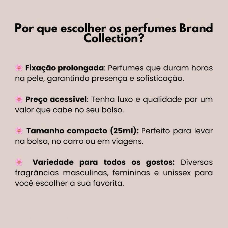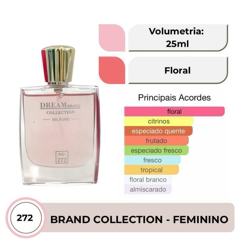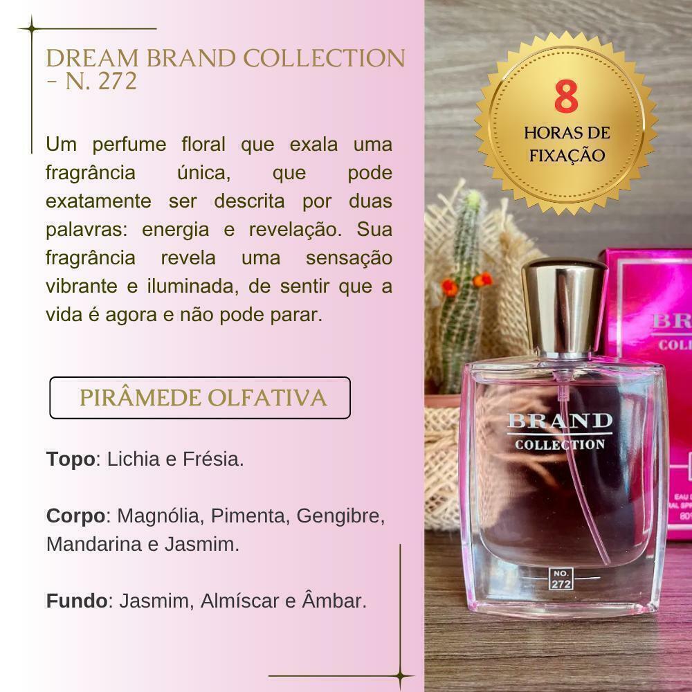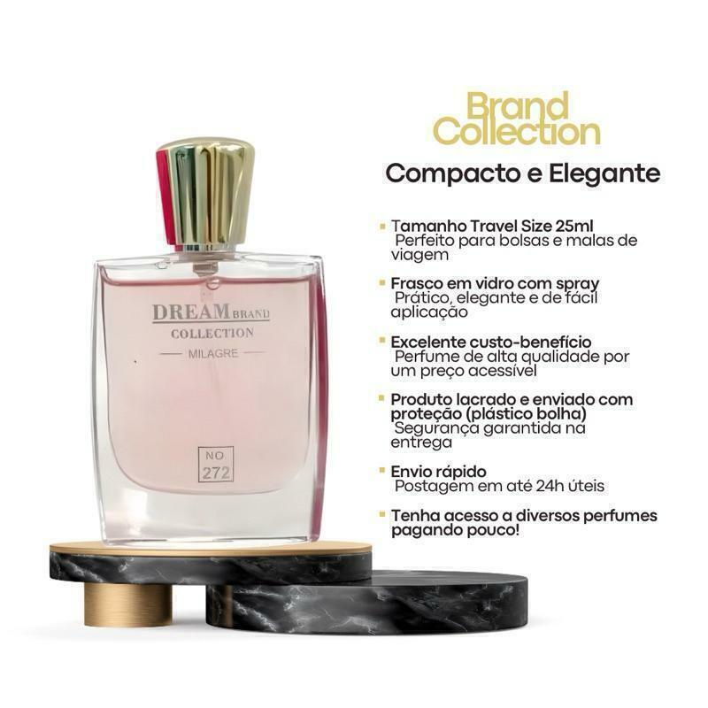 Perfume Feminino Brand Collection 272 Eau de Parfum Importado OriginalUm perfume floral que exala uma fragrância única, que pode exatamente ser descrita por duas palavras: energia e revelação.É uma explosão de aromas que renova a essência feminina, transmitindo elegância e determinação para mulher moderna sem perder a sua delicadeza. Sua fragrância revela uma sensação vibrante e iluminada, de sentir que a vida é agora e não pode parar.Perfumes Brand Collection – Qualidade, praticidade e custo-benefício!️Tamanho ideal para levar com você:Todos os perfumes da linha Brand Collection são desenvolvidos em formato exclusivo de 25ml, no estilo Travel Size (tamanho para viagem).Compactos e práticos, são perfeitos para carregar em bolsas, nécessaires ou malas de viagem, sem ocupar espaço.Possuem borrifador spray que facilita a aplicação e garante melhor aproveitamento da fragrância.Excelente custo-benefício:Ideal para quem deseja ter acesso a uma grande variedade de perfumes sem precisar fazer um alto investimento.Com o valor de um perfume importado tradicional, você pode montar sua coleção com fragrâncias inspiradas nos maiores sucessos da perfumaria mundial.Dicas para potencializar sua fragrância:Sabia que o perfume dura mais quando aplicado nos pontos de maior circulação sanguínea? Veja onde aplicar:️ Atrás dos joelhos️ Dobras dos braços️ NucaEssas áreas naturalmente exalam mais calor, o que ajuda a espalhar o aroma ao longo do dia.Como fazer o perfume durar ainda mais?Hidrate a pele antes da aplicação.Pele hidratada absorve melhor a fragrância e retém o aroma por mais tempo.Dica infalível: Use o hidratante corporal Brand Collection da mesma linha do perfume (ou com aroma neutro) para intensificar e harmonizar o cheiro.Confira nossa linha de Hidratantes Corporais e prolongue sua experiência olfativa!Envio rápido e atendimento dedicado:Todos os pedidos são postados em até 24 horas úteis, garantindo agilidade e cuidado com seu pedido.Produtos enviados lacrados e bem embalados para que cheguem até você com total segurança.Não encontrou seu perfume preferido?Fale com a gente pelo chat!Encomende a fragrância que você deseja e nós buscamos para você.Perfume Feminino Brand Collection (Perfurme Miniatura) inspirados nos seus sonhos, com o tamanho e preço que cabem na sua rotina.