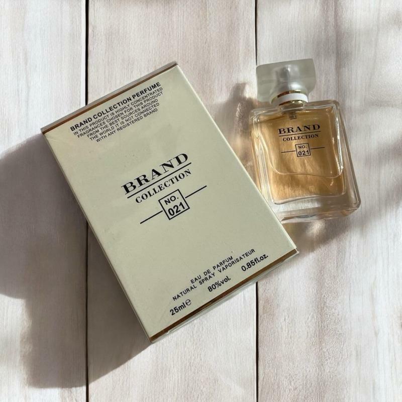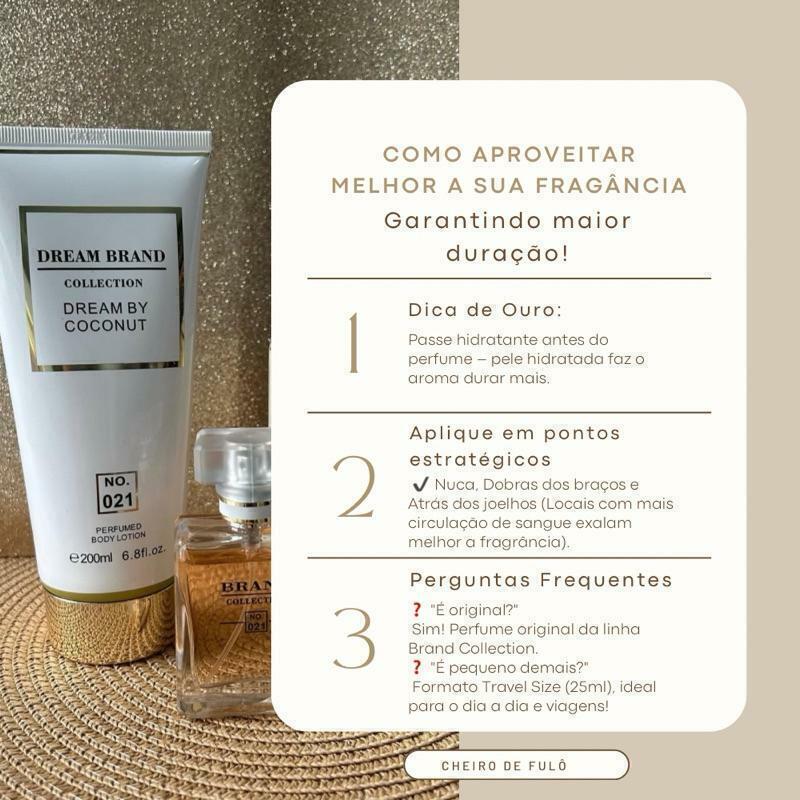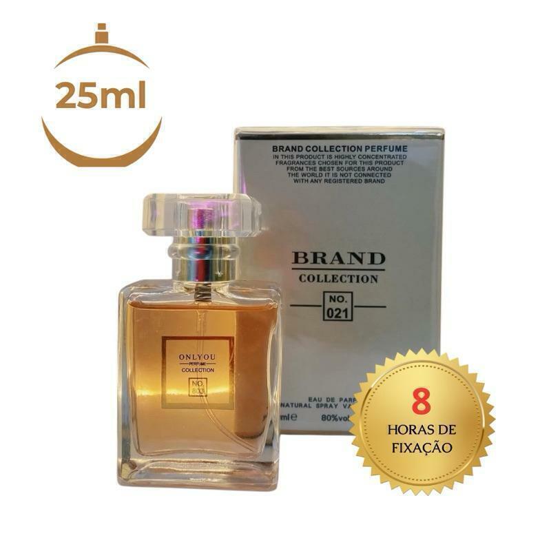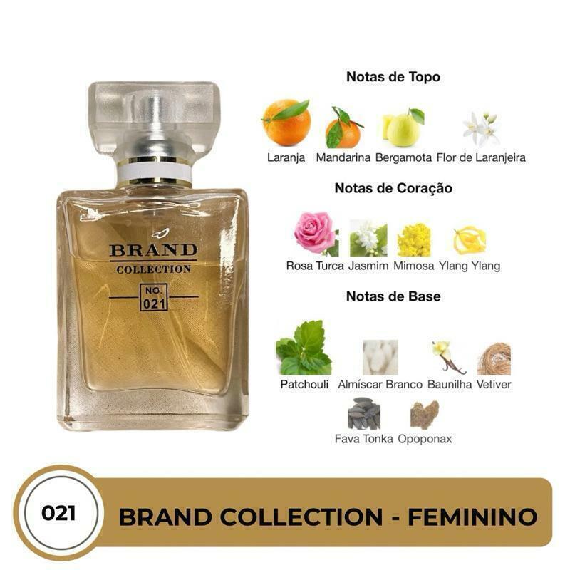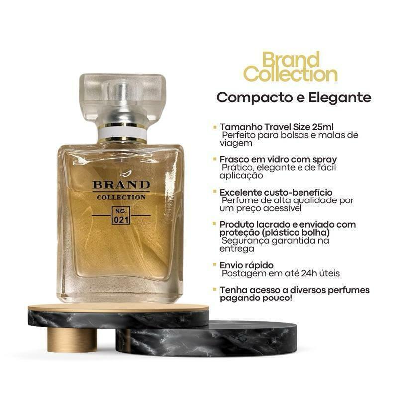 Perfume Feminino Brand Collection 021 Eau de Parfum Importado (Original)Fragrância feminina, marcante e envolvente. Notas florais e amadeiradas que transmitem elegância e confiança. Ideal para todas as ocasiões.Alta fixação e projeçãoCompacto e perfeito para levar na bolsaQualidade premium com ótimo custo-benefícioPerfeito para quem busca um perfume refinado e acessível. Garanta o seu antes que acabe!Pirâmide olfativa:Topo: Laranja, Mandarina, Bergamota e Flor de Laranjeira.Corpo: Rosa Turca, Jasmim, Mimosa e Ylang Ylang.Fundo: Patchouli ou Oriza, Almíscar Branco, Baunilha, Vetiver, Fava Tonka e Opoponax.Ocasião:Muito indicado para climas frios, se adequando de forma excelente tanto de dia quanto de noite. Uma fragrância que convence até mesmo os amantes de perfumes doces. Vale a pena viver esta experiência!Use todos os dias, em todos os momentos, para marcar sua presença de forma inesquecível!    •    perfume importado    •    fragrância marcante    •    perfume elegante    •    perfume com alta fixação    •    perfume duradouro    •    mini perfume    •    perfume de bolsaPerfumes Brand Collection – Qualidade, praticidade e custo-benefício! Tamanho ideal para levar com você:Todos os perfumes da linha Brand Collection são desenvolvidos em formato exclusivo de 25ml, no estilo Travel Size (tamanho para viagem).Compactos e práticos, são perfeitos para carregar em bolsas, nécessaires ou malas de viagem, sem ocupar espaço.Possuem borrifador spray que facilita a aplicação e garante melhor aproveitamento da fragrância.Excelente custo-benefício:Ideal para quem deseja ter acesso a uma grande variedade de perfumes sem precisar fazer um alto investimento.Com o valor de um perfume importado tradicional, você pode montar sua coleção com fragrâncias inspiradas nos maiores sucessos da perfumaria mundial.Dicas para potencializar sua fragrância:Sabia que o perfume dura mais quando aplicado nos pontos de maior circulação sanguínea? Veja onde aplicar:Atrás dos joelhos Dobras dos braçosNucaEssas áreas naturalmente exalam mais calor, o que ajuda a espalhar o aroma ao longo do dia.Como fazer o perfume durar ainda mais?Hidrate a pele antes da aplicação.Pele hidratada absorve melhor a fragrância e retém o aroma por mais tempo. Dica infalível: Use o hidratante corporal brand collection da mesma linha do perfume (ou com aroma neutro) para intensificar e harmonizar o cheiro.Confira nossa linha de Hidratantes Corporais e prolongue sua experiência olfativa!Envio rápido e atendimento dedicado:Todos os pedidos são postados em até 24 horas úteis, garantindo agilidade e cuidado com seu pedido.Produtos enviados lacrados e bem embalados em plástico bolha para que cheguem até você com total segurança.Não encontrou seu perfume preferido?Fale com a gente pelo chat!Encomende a fragrância que você deseja e nós buscamos para você.Perfume Feminino Brand Collection (Perfurme Miniatura) inspirados nos seus sonhos, com o tamanho e preço que cabem na sua rotina.