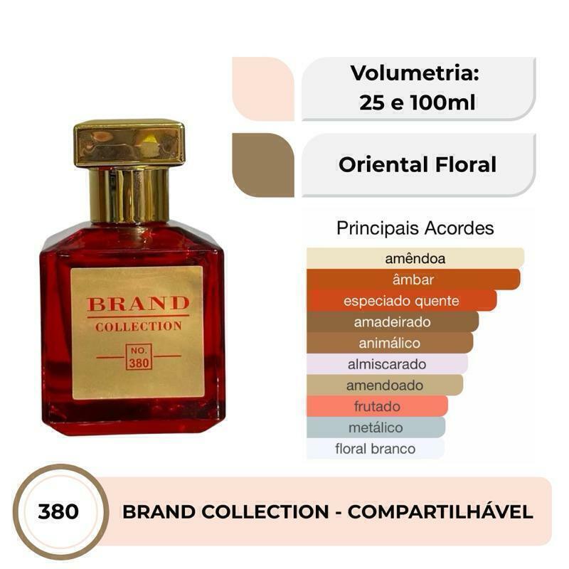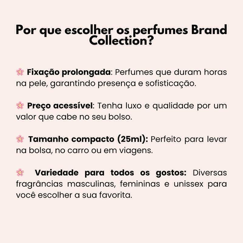 Perfume Brand Collection 380 – Intensidade e Sofisticação em Cada Nota • Família Olfativa: Âmbar FloralUma fragrância ousada, rica e envolvente, que transmite elegância e poder. • Notas de Saída: Amêndoa Amarga e AçafrãoAbertura marcante com toques exóticos e levemente adocicados, que revelam luxo instantâneo. • Notas de Coração: Jasmim Egípcio e CedroUm coração floral e amadeirado que equilibra delicadeza e profundidade. • Notas de Fundo: Âmbar Cinzento, Almíscar e Notas AmadeiradasFundo quente, sensual e duradouro que deixa um rastro inconfundível por onde passa. • Estilo: Misterioso, refinado e magnéticoIdeal para quem gosta de fragrâncias intensas, sofisticadas e com presença marcante. • Ocasiões: Perfeito para noites especiais, eventos formais ou quando quiser impressionar. • Fixação e projeção: Altíssima performance — fragrância que dura por horas e se destaca. • Tamanho: 25ml e 100mlCompacto e poderoso, cabe no seu dia a dia com toque de exclusividade. Perfumes Brand Collection – Qualidade, praticidade e custo-benefício! ️ Tamanho ideal para levar com você:Todos os perfumes da linha Brand Collection são desenvolvidos em formato exclusivo de 25ml, no estilo Travel Size (tamanho para viagem).Compactos e práticos, são perfeitos para carregar em bolsas, nécessaires ou malas de viagem, sem ocupar espaço.Possuem borrifador spray que facilita a aplicação e garante melhor aproveitamento da fragrância. Excelente custo-benefício:Ideal para quem deseja ter acesso a uma grande variedade de perfumes sem precisar fazer um alto investimento.Com o valor de um perfume importado tradicional, você pode montar sua coleção com fragrâncias inspiradas nos maiores sucessos da perfumaria mundial. Dicas para potencializar sua fragrância:Sabia que o perfume dura mais quando aplicado nos pontos de maior circulação sanguínea? Veja onde aplicar:️ Atrás dos joelhos️ Dobras dos braços️ NucaEssas áreas naturalmente exalam mais calor, o que ajuda a espalhar o aroma ao longo do dia. Como fazer o perfume durar ainda mais? Hidrate a pele antes da aplicação.Pele hidratada absorve melhor a fragrância e retém o aroma por mais tempo. Dica infalível: Use o hidratante da mesma linha do perfume (ou com aroma neutro) para intensificar e harmonizar o cheiro. Confira nossa linha de Hidratantes Corporais e prolongue sua experiência olfativa! Envio rápido e atendimento dedicado:Todos os pedidos são postados em até 24 horas úteis, garantindo agilidade e cuidado com seu pedido.Produtos enviados lacrados e bem embalados para que cheguem até você com total segurança.Não encontrou seu perfume preferido?Fale com a gente pelo chat! Encomende a fragrância que você deseja e nós buscamos para você.Perfume Feminino Brand Collection (Perfurme Miniatura) inspirados nos seus sonhos, com o tamanho e preço que cabem na sua rotina.